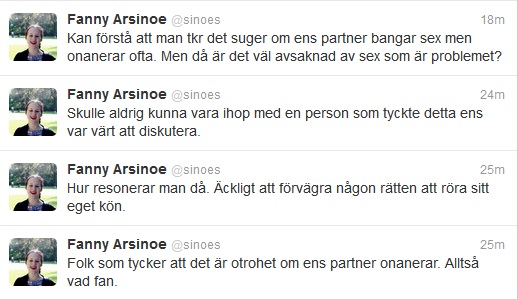 Jag pratar inte utav egna erfarenheter, utan vad jag TROR är problemet. Håller med Fanny om att det är helt befängt att förbjuda onani i en relation (bättre att någon fantiserar om att ligga med någon annan, än att den faktiskt gör det – vilket kan bli konsekvensen av ett sådant förbund), men jag tyckte hon hade fel utgångspunkt i varför någon förbjuder sin partner att onanera.