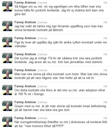 Men om de inblandade tycker något annat och har skrivit ett kontrakt på det, så spelar det väl ingen roll att du och jag tycker att det _egentligen_ är kvinnan som bär barnet som är mamman? Väljer man att bli surrogatmoder är man ju förhoppningsvis medveten om vad man ger sig in på, visst kanske man känner en viss separationsångest då man krystat ut ungen eftersom man trots allt burit den i sin kropp under nio månader, men det är liksom något man får räkna med. Och jag vägrar tro att det för alla surrogatmödrar är så jobbigt att de känner sig som slavar utan några rättigheter.